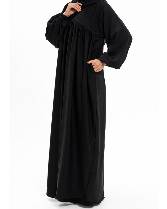 Black Medina Silk Nursing Friendly Abaya with Balloon Sleeves and Pockets